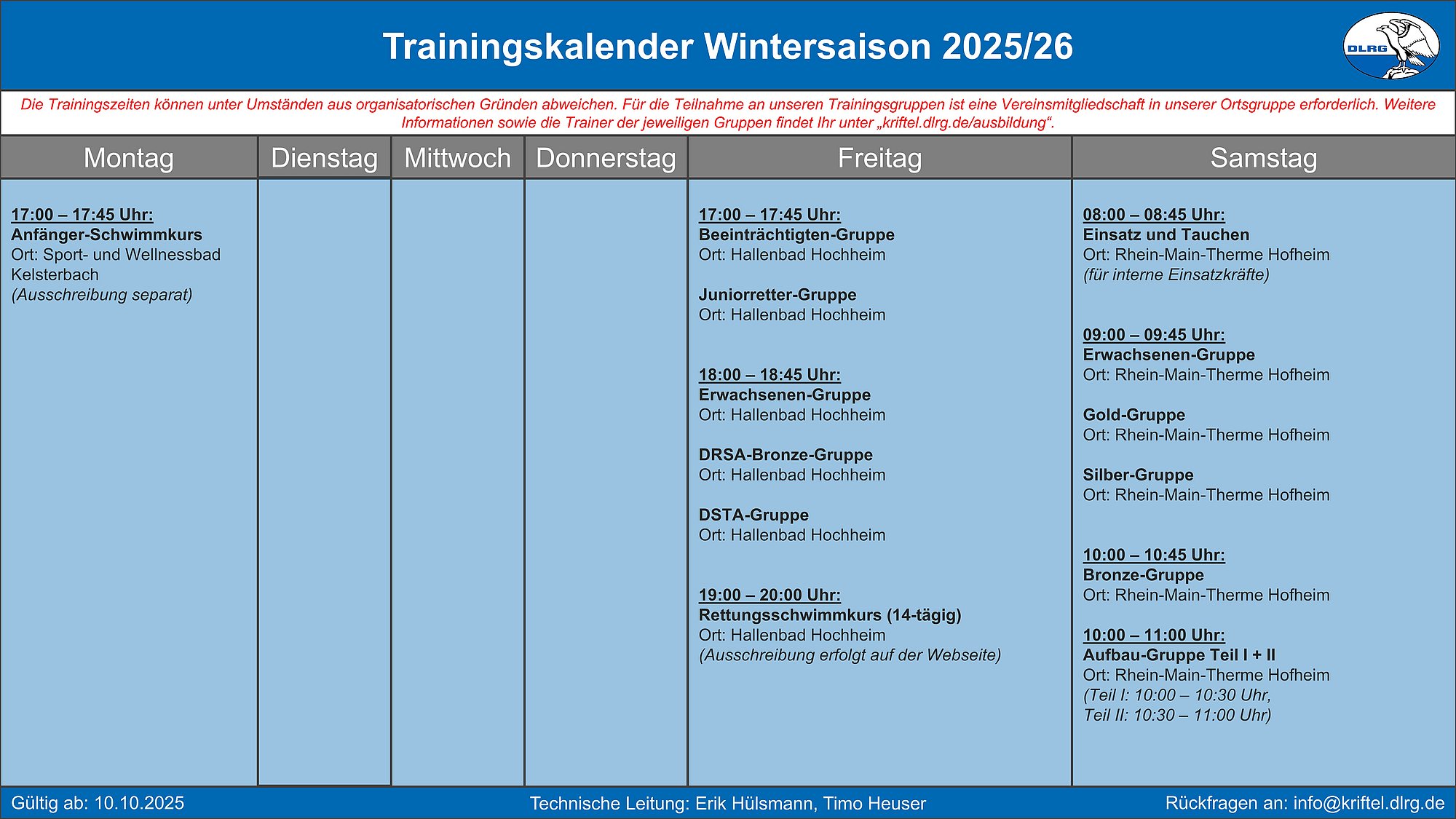 In der folgenden Übersicht finden Sie alle im wöchentlichen Rhythmus angebotenen Trainingsmöglichkeiten. Die Teilnahme ist den Mitgliedern der DLRG OG Kriftel e.V. vorbehalten.
